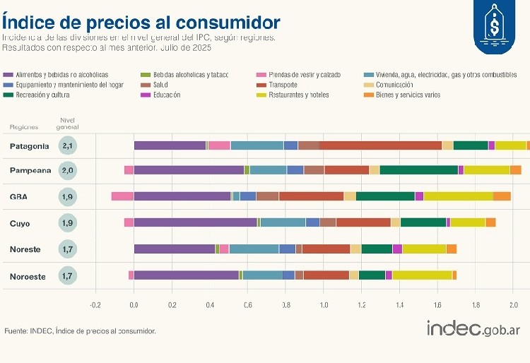 La división de mayor aumento en el mes fue recreación y cultura (+4,8%), debido a las vacaciones de invierno, seguida de transporte (+2,8%), por subas en el boleto de transporte público. La división con mayor incidencia fue alimentos y bebidas que avanzó 1,9% por aumentos en verduras, tubérculos y legumbres, carnes y derivados y pan y cereales en las regiones GBA, Pampeana, Noreste, Noroeste y Cuyo. En cambio, en Patagonia la mayor incidencia se registró en transporte.